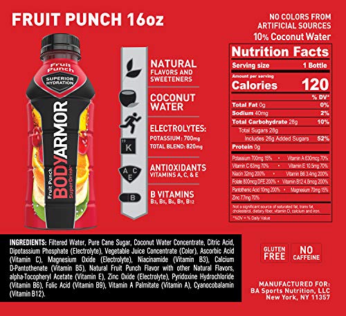 BODYARMOR Sports Drink Sports Beverage, Fruit Punch, Natural Flavors With Vitamins, Potassium-Packed Electrolytes, Perfect For Athletes, 16 Fl Oz (Pack of 12)