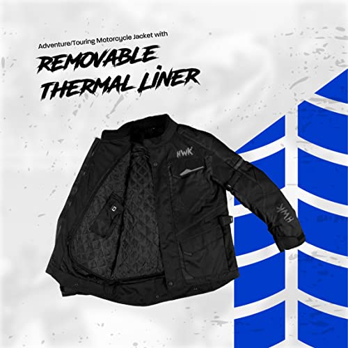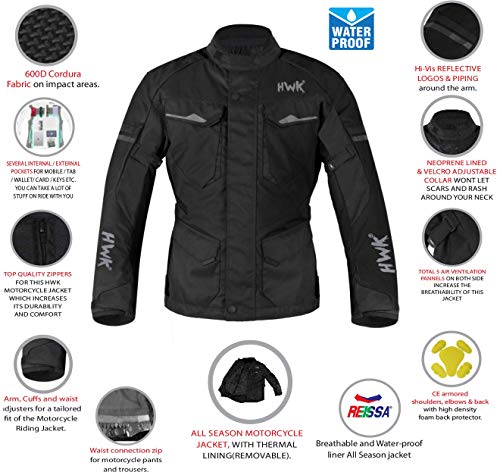 - WEATHER ADVENTURE motorcycle jackets mens, 600D CORDURA CONSTRUCTION Textile Motorcycle Touring Jacket , The HWK Motorcycle Jacket mens is an all season motorbike riding jacket at its best: rugged and strong, yet soft and comfortable to the touch to keep you warm during winter, cool during summer and safe at the same time