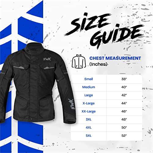 - 5 YEAR REPLACEMENT WARRANTY ON ALL HWK GEAR :) Chest Measurement Size Guide(inches): Small 38'', Medium 40'', Large 42'', X-Large 44'', XX-Large 46'', 3XL 48'' , 4XL 50'' , 5XL 52''. . If you're between sizes then please choose the smaller size for a snug fit or for a loose/baggy fit choose the upper size. All weather/season ADV Motorcycle jacket armor with REMOVABLE WINTER THERMAL LINING