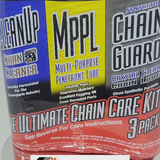 Clean Up, MPPL, and Chain Wax are a winning combination proven to increase horsepower and extend chain and sprocket life. Maxima Clean Up is an emulsion-type degreaser excellent for chains and sprockets that easily washes out with water. Maxima MPPL is a superior all-purpose spray-on penetrating lubricant that provides an excellent barrier against rust & corrosion. Great for displacing moisture. Maxima Chain Wax is Americas #1 chain lubricant. Exclusive Parafilm formula sprays on as a liquid, penetrates and then sets up as a soft waxy film, creating an excellent lube that protects the chain from the elements. Outstanding rust & corrosion protectant. Will not fling-off or attract dirt.