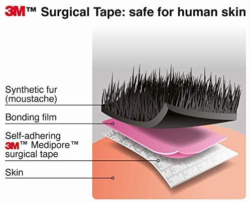 Details: This real size self-adhesive mustache is handmade. It is attached by means of a specific 3M medical plaster (on the back side of mustache). This anti-allergic plaster does not irritate the skin, is easily stuck and removed. If necessary this mustache may be cut, combed, or shaped by wet hands or simply by hair spray. If you want to apply the mustache several times, use new medical plaster or two-sided sticky tape